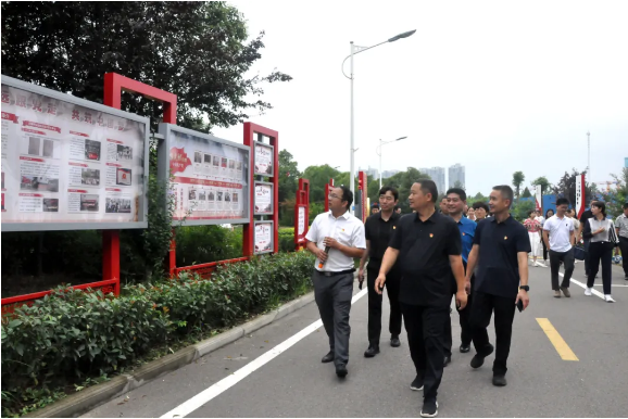 杨哲陪同观摩团实地走访了炎黄科技园党建阵地、党员活动室、“三新”大讲堂、党建文化长廊等。